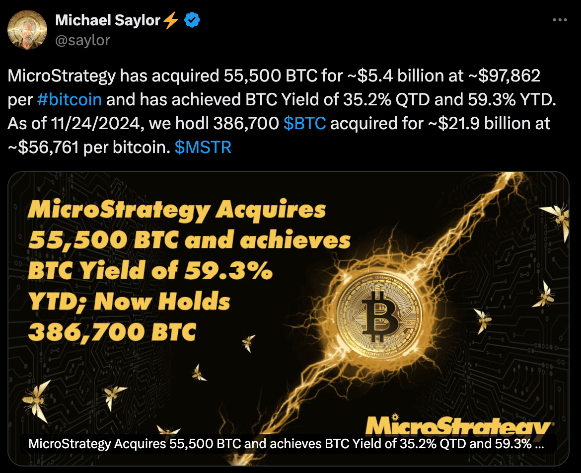 هذه المرة، استحوذت شركة MicroStrategy على 55000 بيتكوين مقابل حوالي 5.4 مليار دولار. (بمتوسط حوالي 97862 دولارًا لكل عملة بيتكوين)