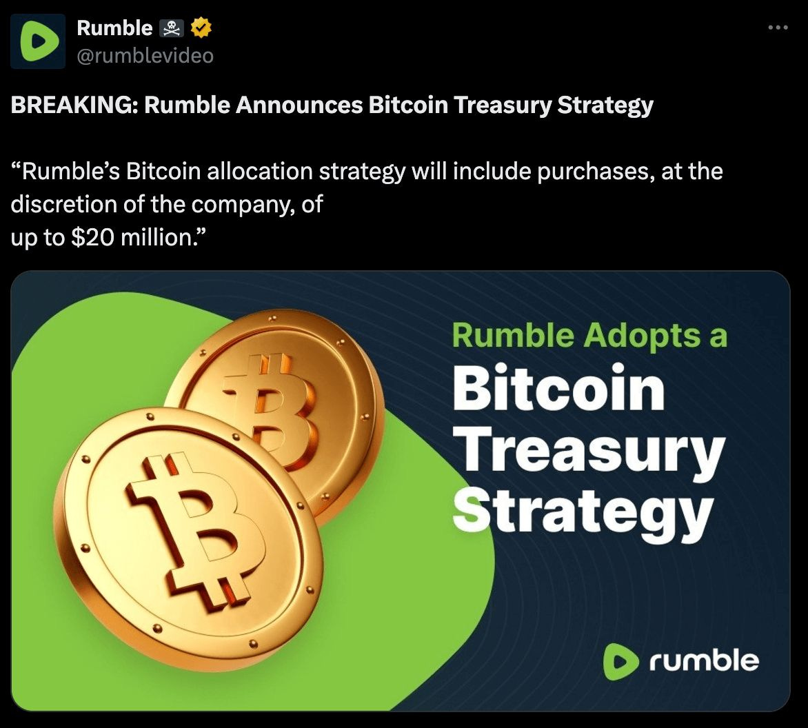 أعلنت شركة البث المباشر العملاقة Rumble للتو أنها تخطط لشراء عملة بيتكوين بقيمة 20 مليون دولار.🤯