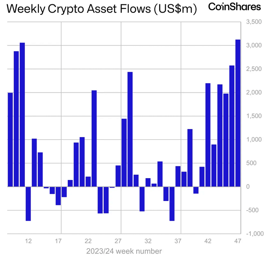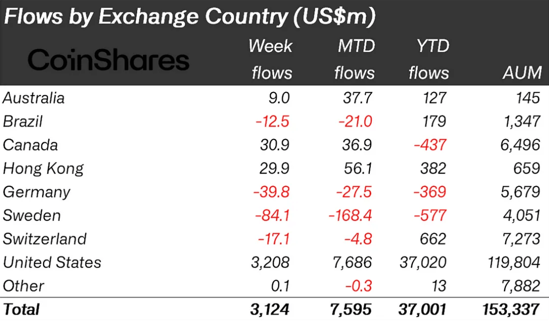 في الأسبوع الماضي، شهدت صناديق الأصول الرقمية تدفقات صافية ضخمة بلغت 3.124 مليار دولار.