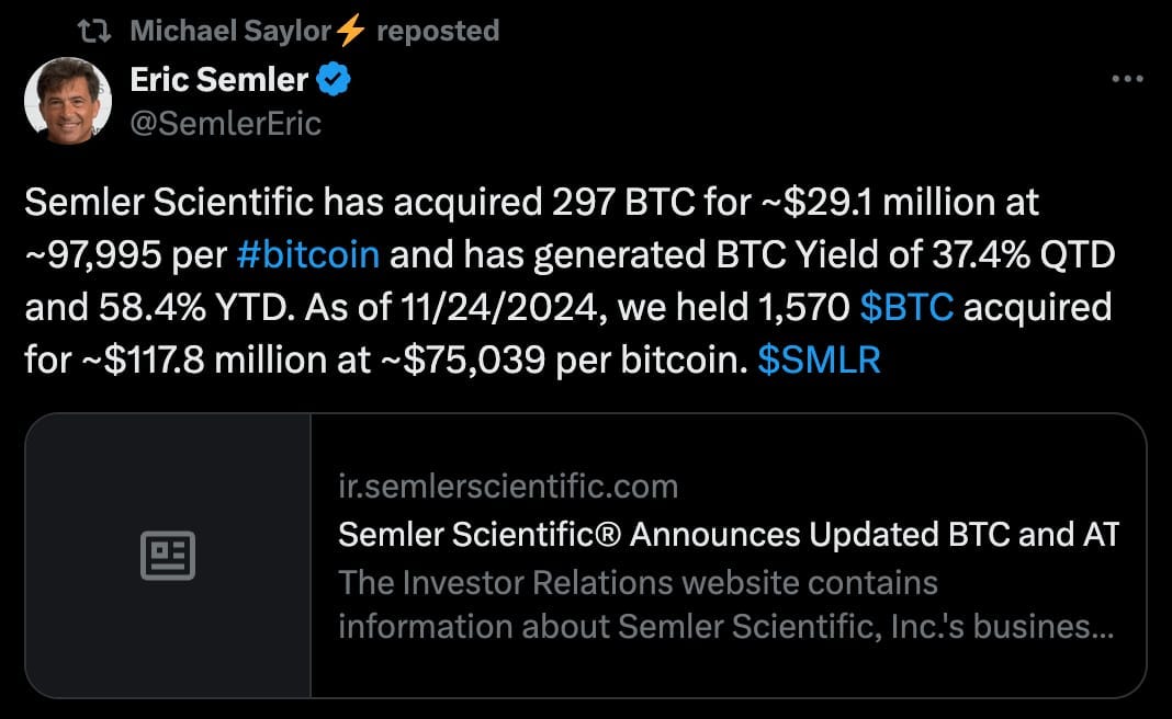 أعلنت شركة Semsler Scientific للتو أنها اشترت 297 بيتكوين إضافية مقابل حوالي 29.1 مليون دولار.