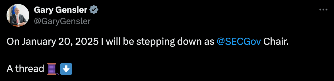 أعلن جاري جينسلر للتو أنه سيتنحى عن منصبه في 20 يناير 2025.