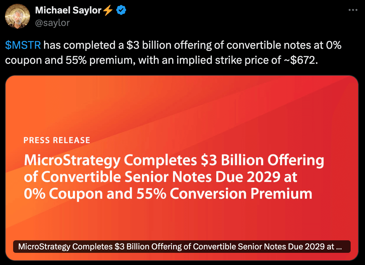 أعلن مايكل سيلور أن شركة مايكروستراتيجي أكملت طرح ديونها بقيمة 3 مليارات دولار. (انظر إلى معدل الفائدة 0%... أموال مجانية حرفيًا)