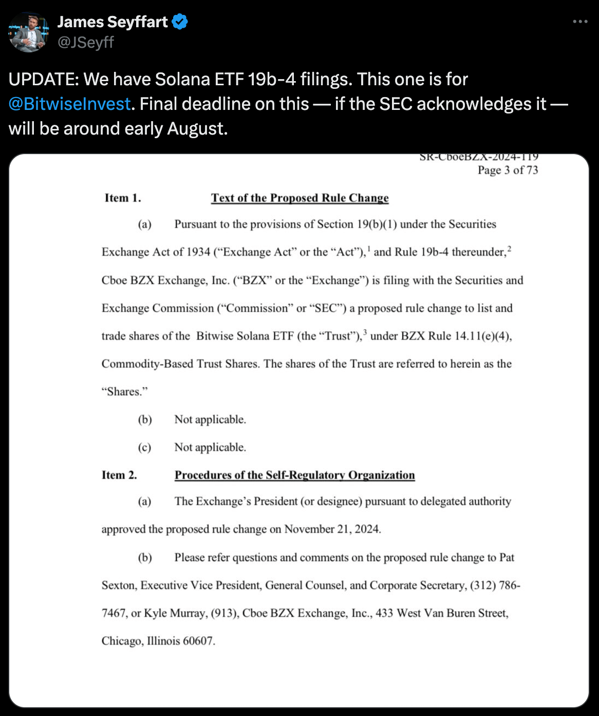 أفادت الصحفية إليانور تيريت من Fox Business أيضًا أن المحادثات بين الجهات المصدرة ولجنة الأوراق المالية والبورصات "تتقدم" فيما يتعلق بموافقات Solana ETF.